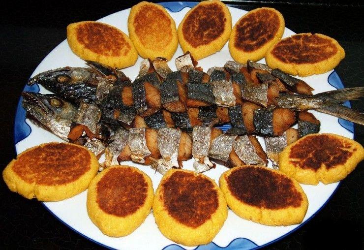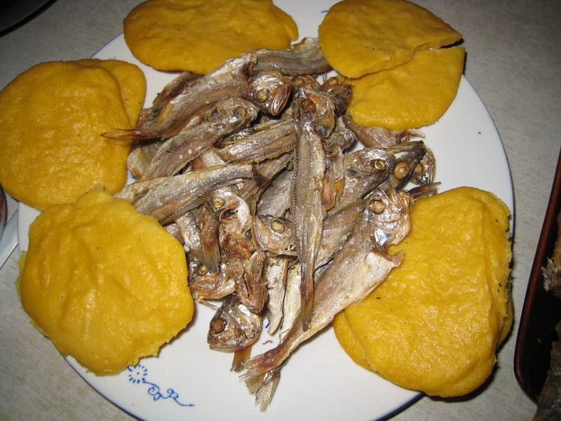新鲜的海鱼用盐腌过,在阳光下晒干,然后放在铁锅里,搁少许油,煎得外焦里嫩,和玉米面饼子一起吃味道独特。